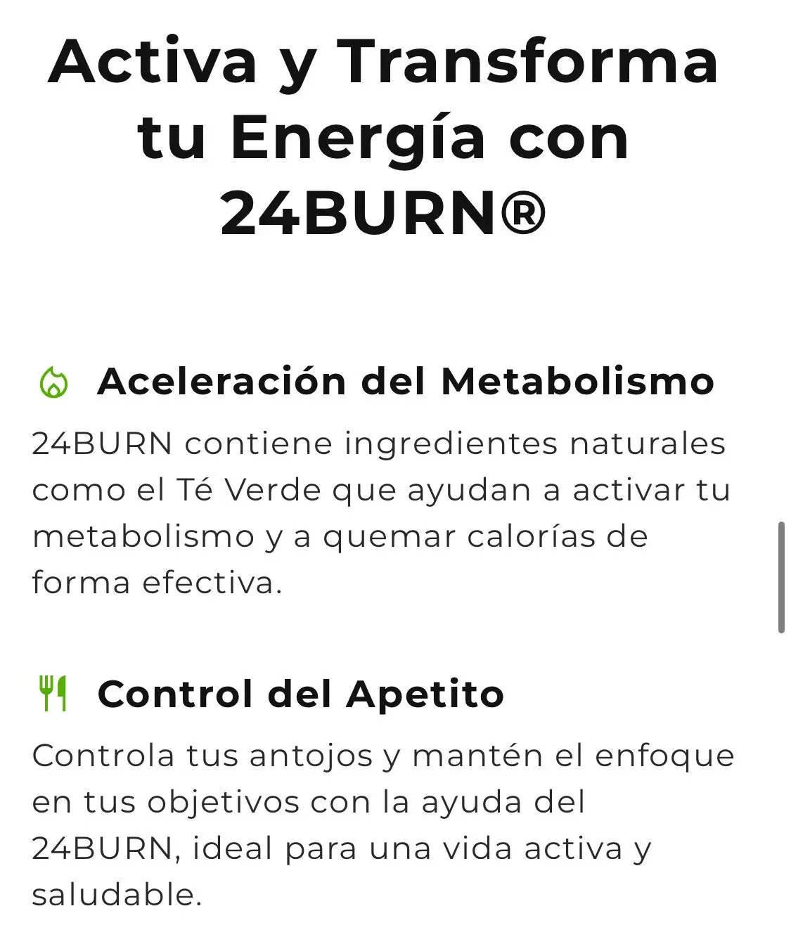 Formulado con una poderosa combinación de ingredientes naturales, 24BURN está diseñado para impulsar tu metabolismo, ayudarte en el proceso de pérdida de peso, y ofrecerte una sensación de energía y bienestar desde la primera toma.