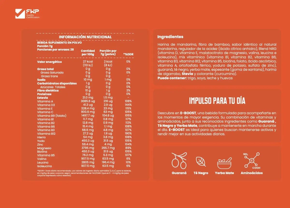 Más que una bebida, E-BOOST es un suplemento en polvo con energía saludable, diseñado para ayudarte a despertar tu máximo potencial físico y mental, gracias a una poderosa combinación de ingredientes naturales, vitaminas y aminoácidos que transforman tu día desde adentro hacia afuera.