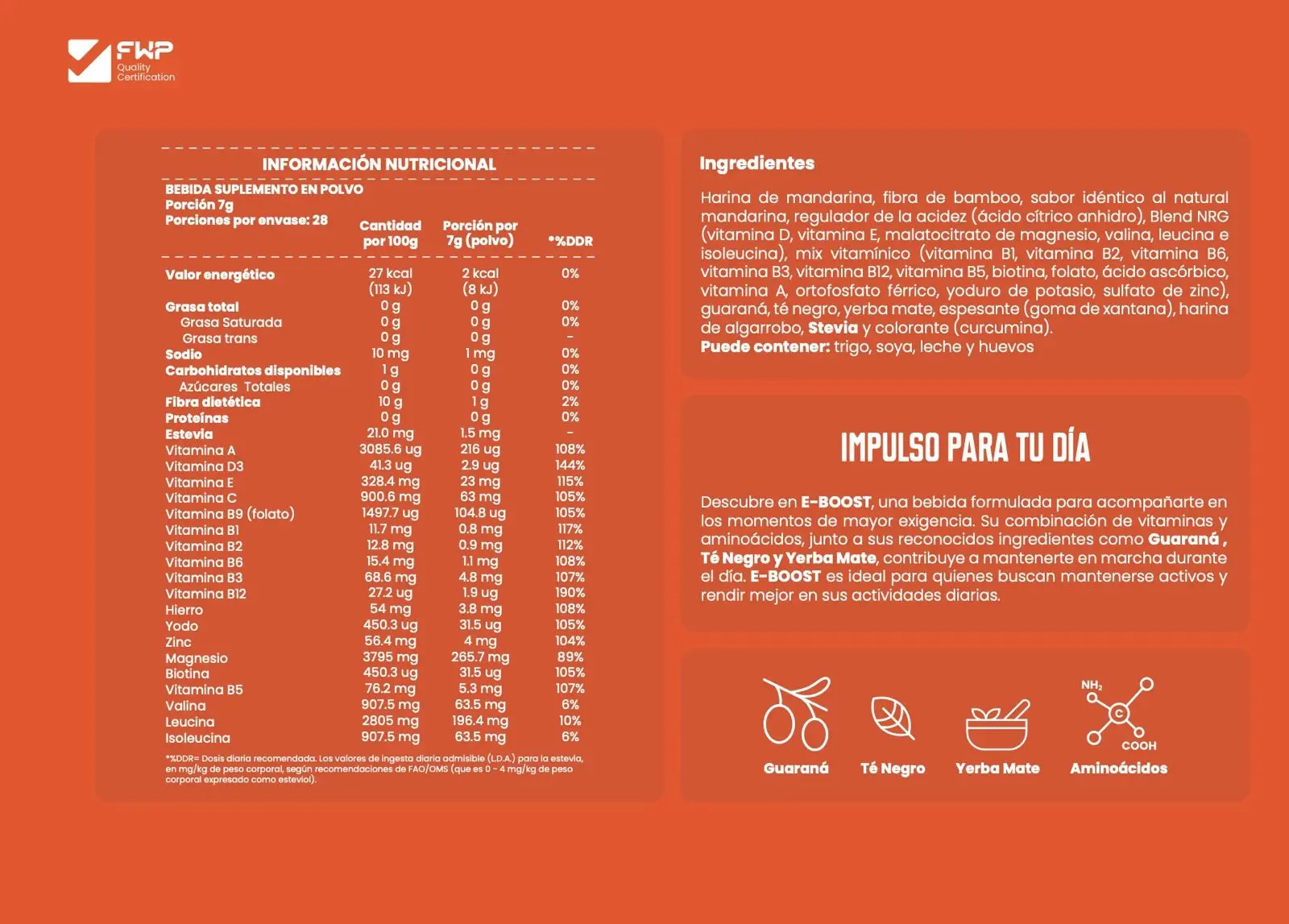 Formulado con Guaraná, Té negro y Yerba Mate, conocidos por su capacidad de entregar energía sostenida y natural sin causar el bajón típico de otras bebidas energéticas.